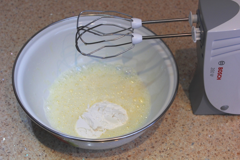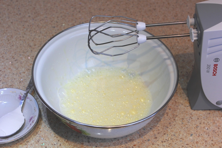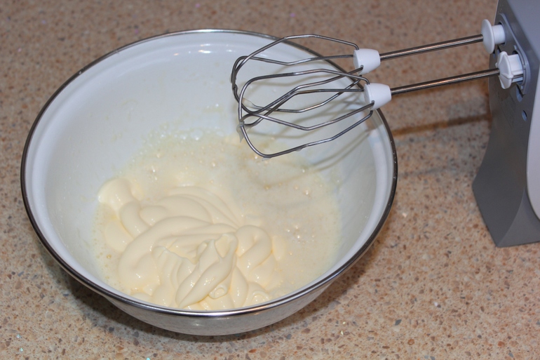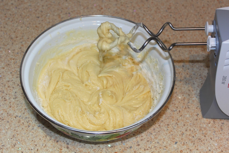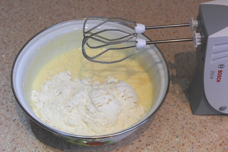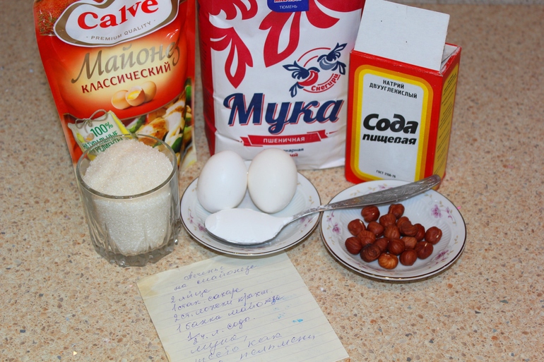 2 яйца, 1 стакан сахара, 2 столовые ложки крахмала, 1 стакан майонеза, ½ ч. ложки соды, мука. Количество муки должно соответствовать консистенции пельменного теста.