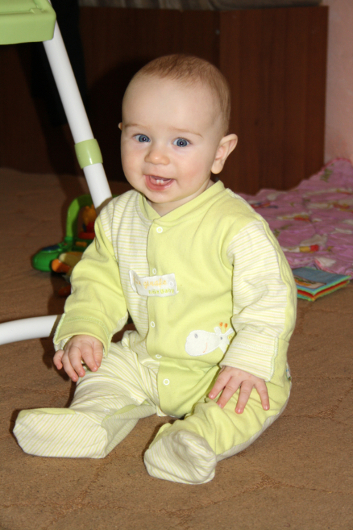 Вес 8300,рост 70,5 см. Все так же 2 зуба, верхние на походе,но все никак. Ползает со скоростью звука, сам уже садится , встает. В связи с этим на лбу все чаще появляются синячки. Ест овощние пюрешки домашнего приготовления:картошку, морковку,кабачек, тыкву, броколи,цветную капусту. Из фруктов-яблоко,банан. Причем яблоко не очень любит. Кашку купили безмолочную, уже опробовали гречку и рис. Сегодня на очереди овсянка.Иногда грызет печеньки и хлеб.