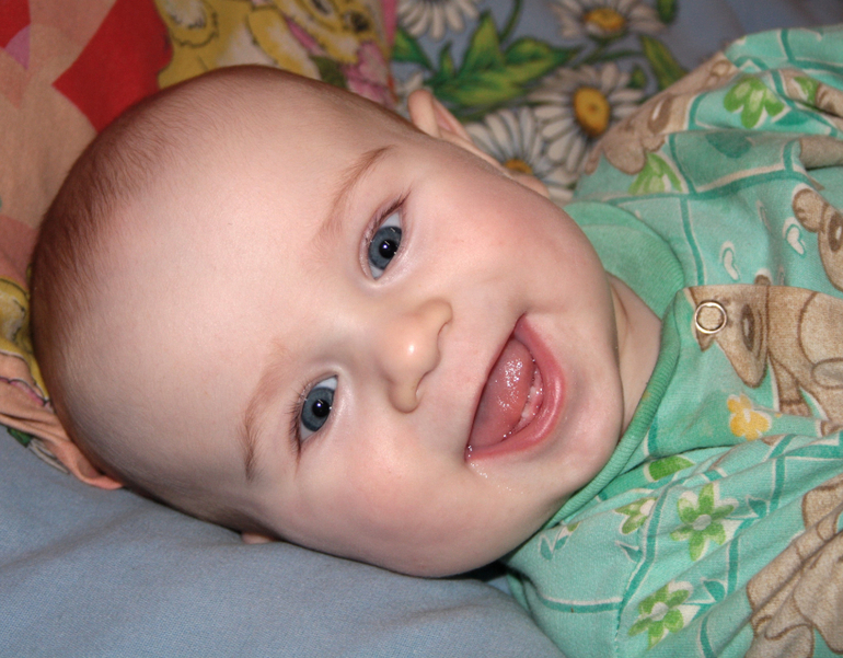Вес-7900, рост-69.Два нижних зуба, сам еще не сидит, но активно делает попытки ползать.Уже может добраться туда, куда ему надо. Уже четыре дня как ввели прикорм. Начали с кабачка, ест, но без эмоций.Даю понемножку грызть яблоко и печеньки( вот печеньки ему нравятся). Появились звуки ва-ва-ва и га-га-га. Ну и фото на память