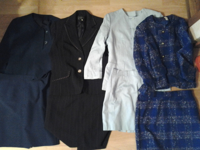 Света возьму костюмы, где юбка не сильно короткая. Белый вроде короткая юбка, а синий и черный не пойму.