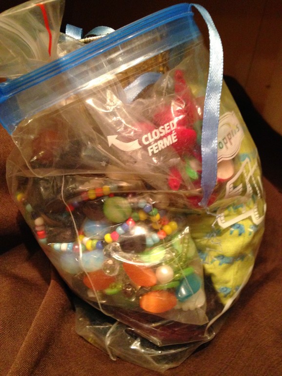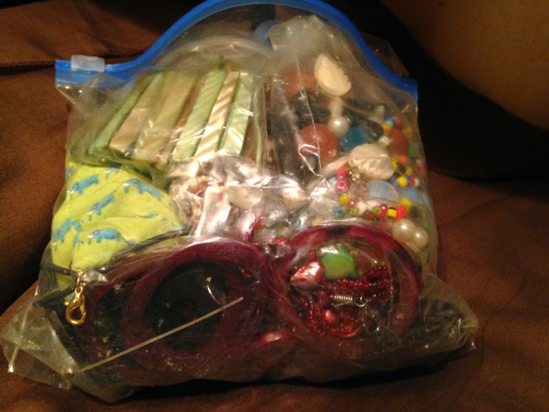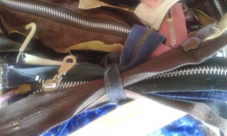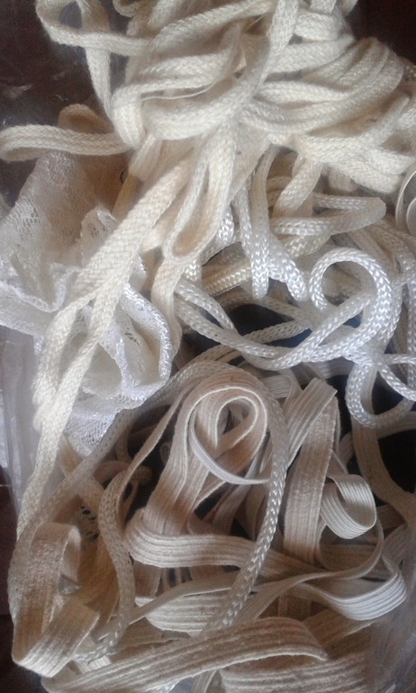 И еще отдельный мешок с нитками, молниями, тесьмой, кольца для ковров, вязальные крючки, спицы, резинка, застежки. Экв. 1500 рублей.