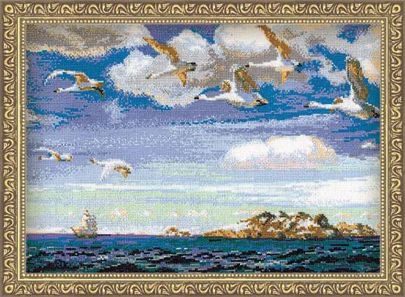 Набор для вышивания счетный крест . Производитель: Риолис (Россия) Тип схемы: Цветная символьная схема Канва: Канва № 6 / Аида 16 . По мотивам картины Рылова "В голубом просторе". Эквивалент 600 рублей.