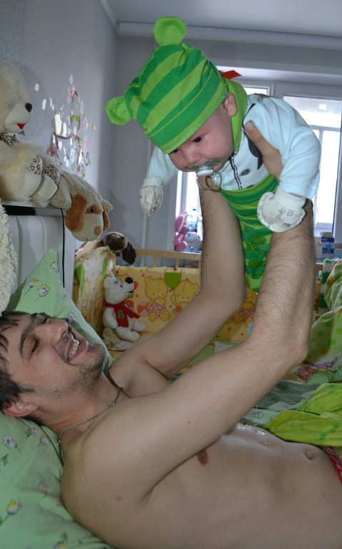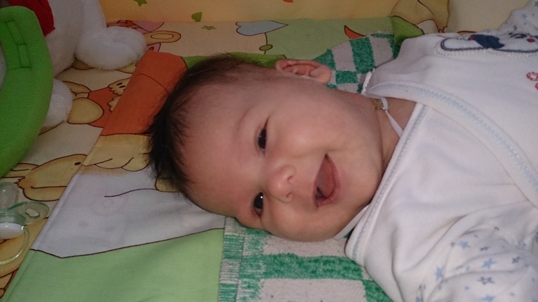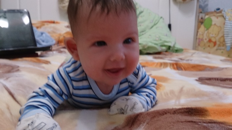 даже приподнимается на локтях, а когда ползет упирается ногами опускает голову и давай кряхтеть, стараться изо всех сил, поднимает голову передохнет и снова за свое :)))) вот так носом и пашем-ползем по пледу. Маму с папой узнаете всегда им рад , всегда улыбается в ответ.