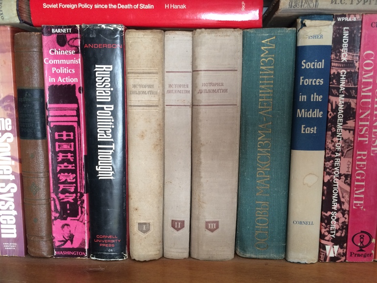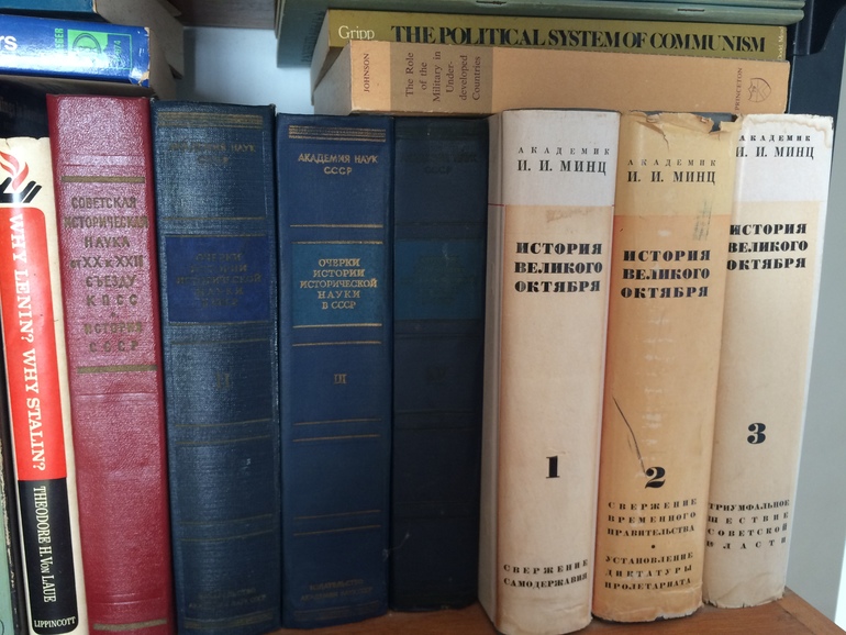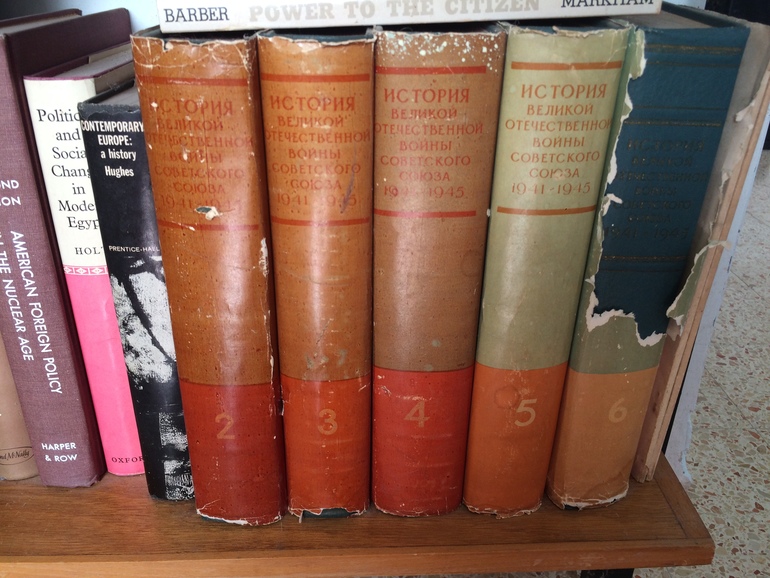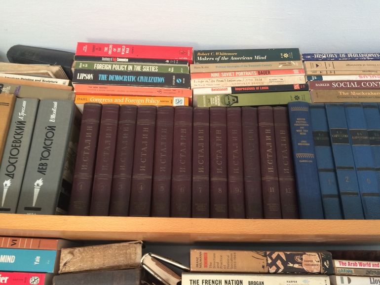 В основном, книги на английском, но есть на иврите и на русском. Хозяин библиотеки - профессор истории, сейчас ему уже больше девяноста лет. Так что тут есть разные раритеты, вроде подборки брошюр Льва Троцкого.