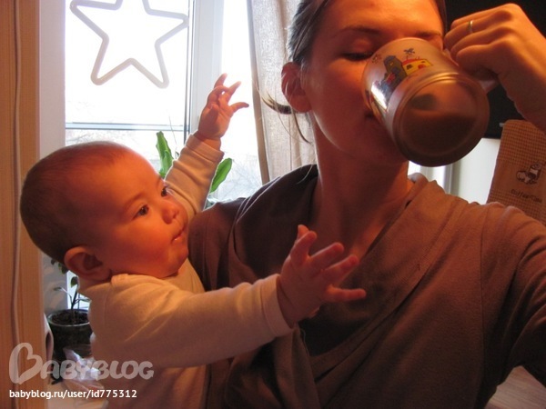 Маюша по утрам завтракает со мной. Сидит в кресле, руководит игрушками, пока я ем. Чаще всего ей надоедает быстрее, чем я успеваю закончить, и она начинает конючить. Чтобы отвлечь ребенка, я стала громко и четко называть предметы под рукой и показывать ей. Так вышло, что чаще всего мне попадались кружка, ложка и пульт. Через пару дней Маюша стала поворачивать голову в сторону, где обычно лежат пульт, кружка или ложка. Но кружка нравилась больше всех!