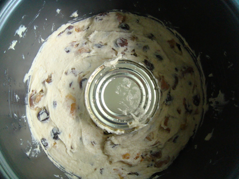 Мультиварку смазать маслом. Я хотела сделать кольцом, поэтому вставила жестяную банку от консервов в середину и выложила тесто: