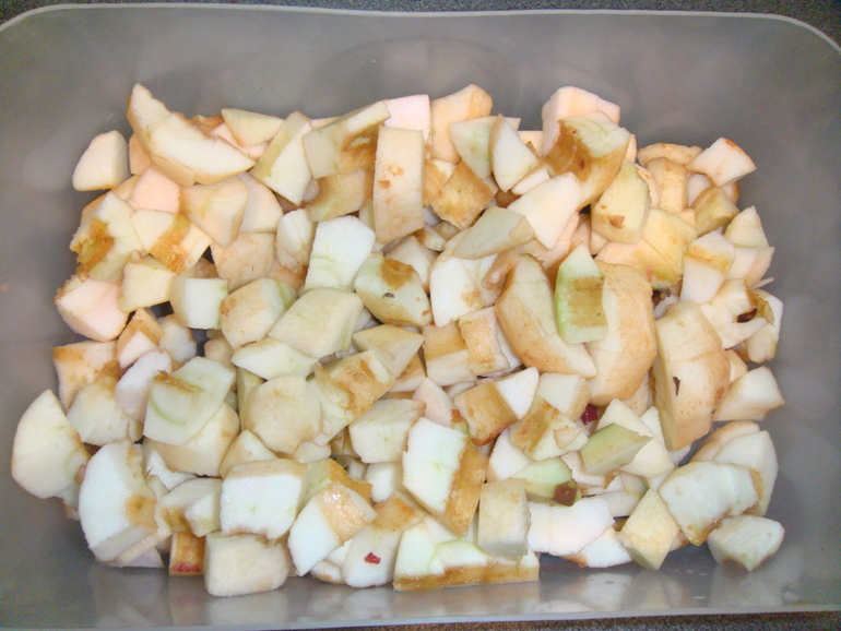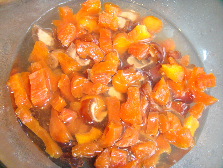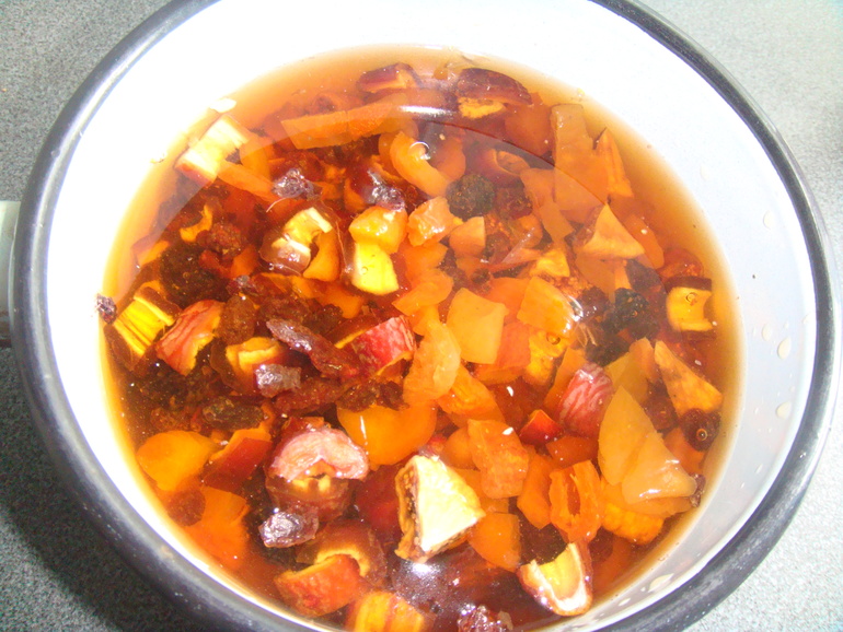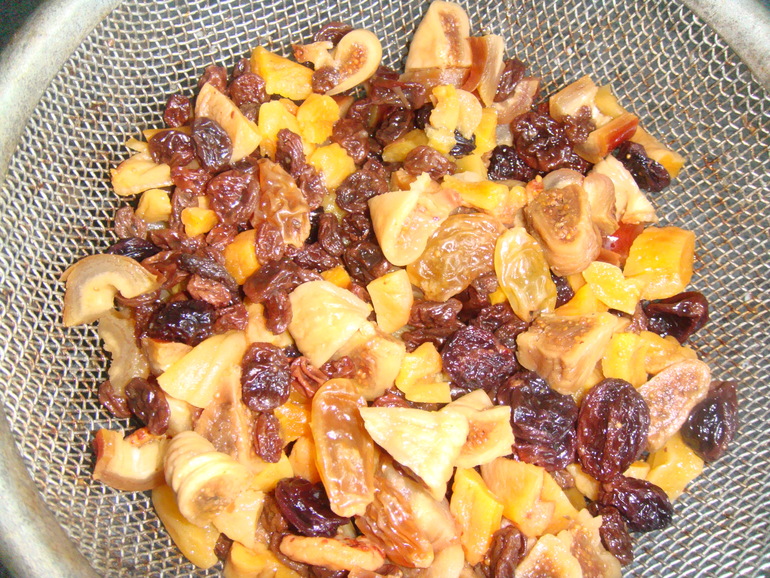 Сухофрукты - дело полезное. Особенно для кормящей дочи. Поэтому использую их сейчас часто. Вот и творожник с ними. Промыть, нарезать, замочить в горячем чае или кипятке: