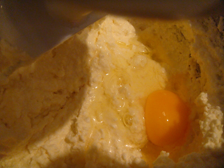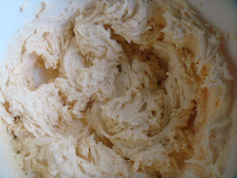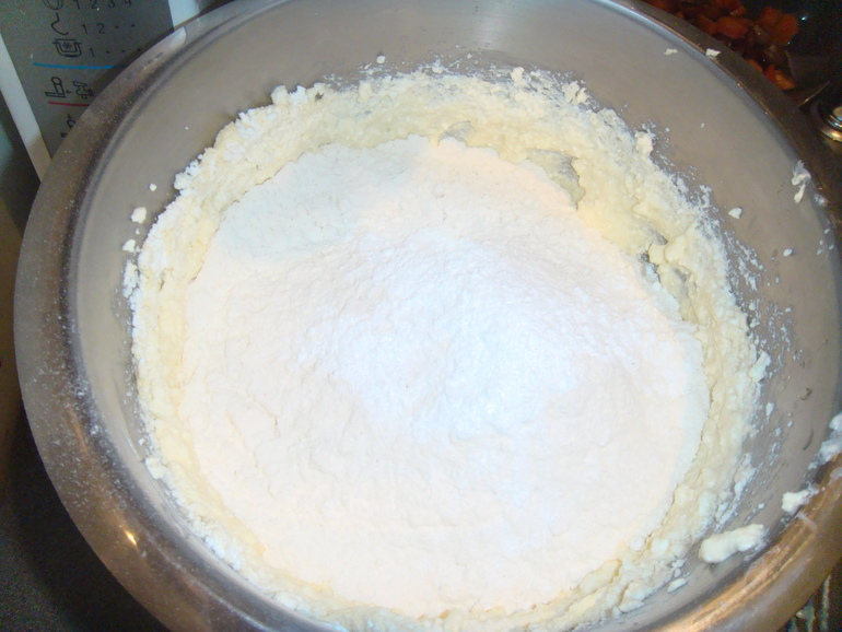 В 350 г муки добавить 0,5 ч.л. соли и 1 ч.л. разрыхлителя. Всыпать в творожную массу, перемешать лопаткой: