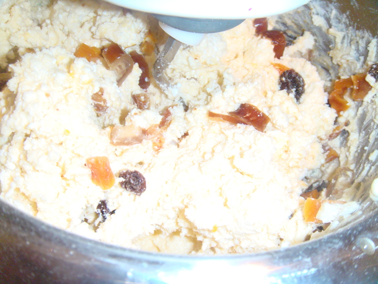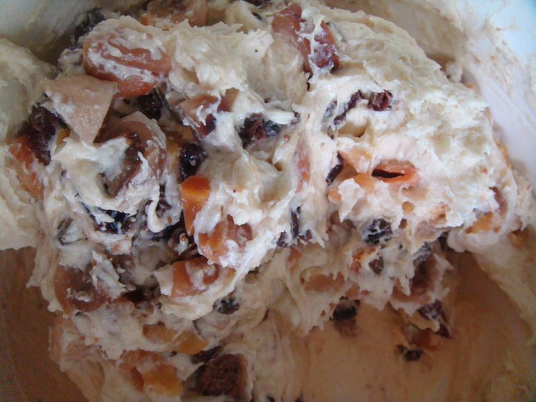 Сухофрукты слить, обсушить на полотенце, добавить в тесто и аккуратно перемешать: