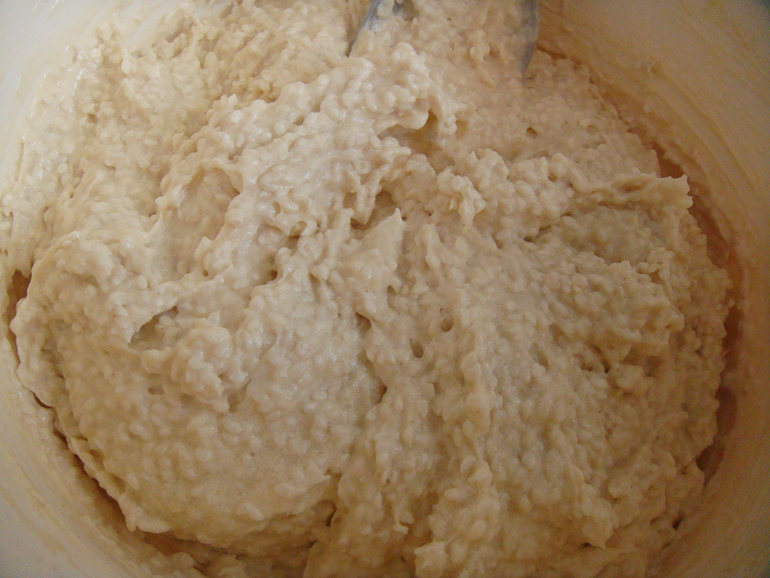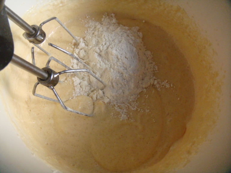 Добавить 200 г муки, 1 ч.л. разрыхлителя, ванилин:
