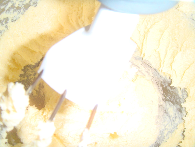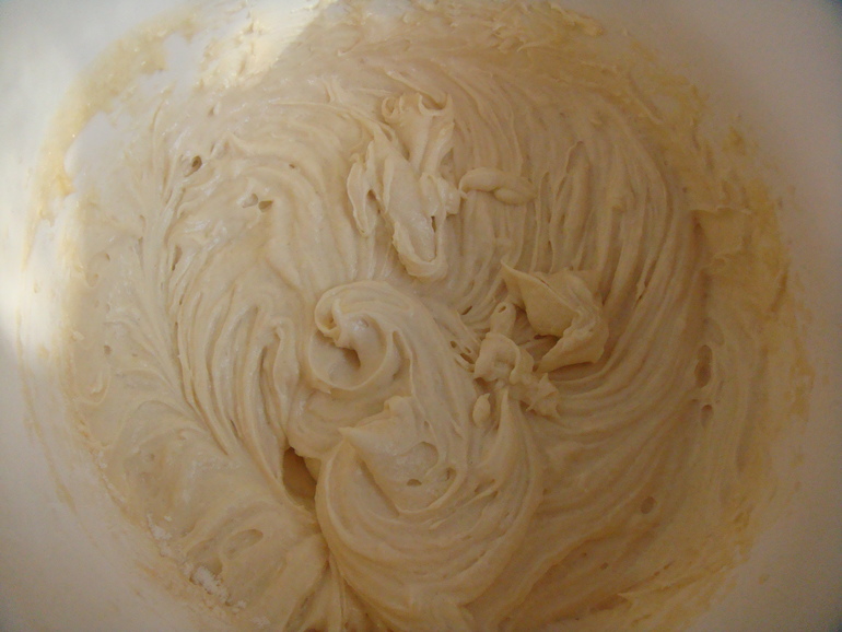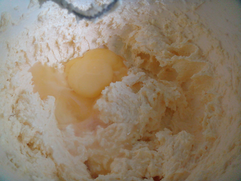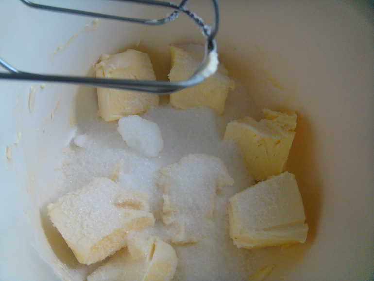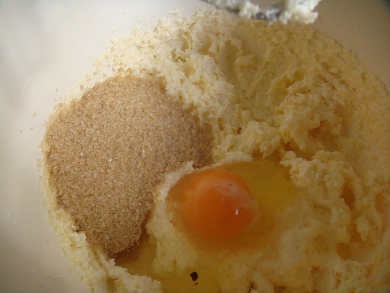150 г маргарина взбить со 100 г коричневого сахара. Добавить 1 яйцо: