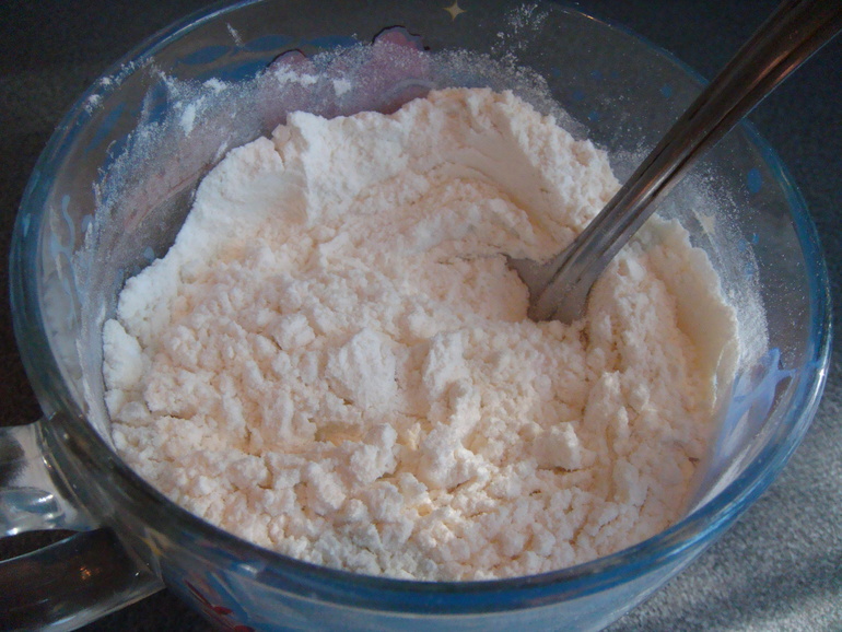 Смешать 100 г муки, 0,5 ч.л. разрыхлителя, соль: