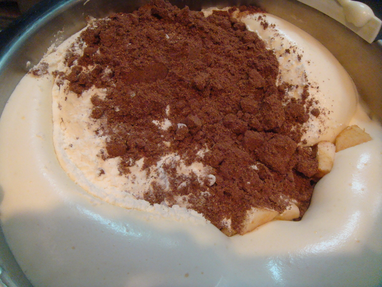 Во взбитую яичную смесь всыпать яблоки и муку с черемухой: