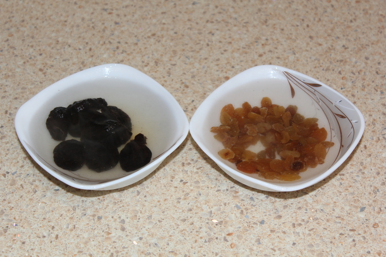 Изюм и чернослив промыть, залить горячей водой для набухания