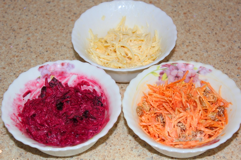 Свекла отварная, морковь сырая, зубчик чеснока, сыр, изюм, чернослив, майонез
