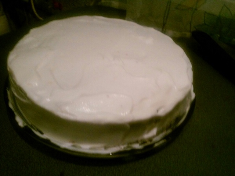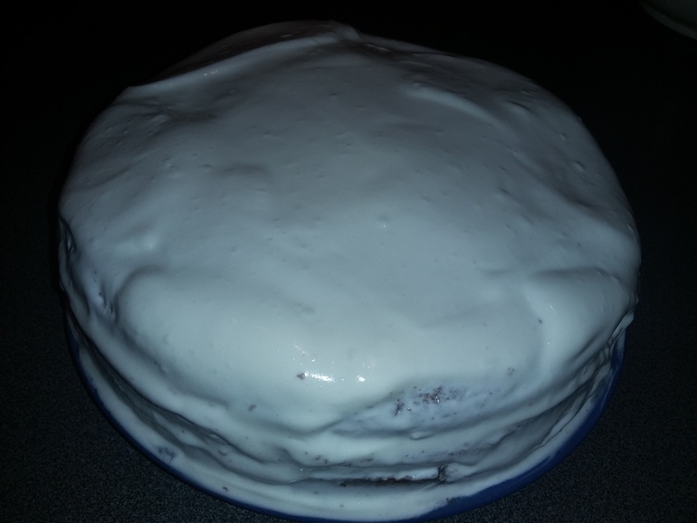 Сложить торт. Верх и бока - тоже залить кремом: