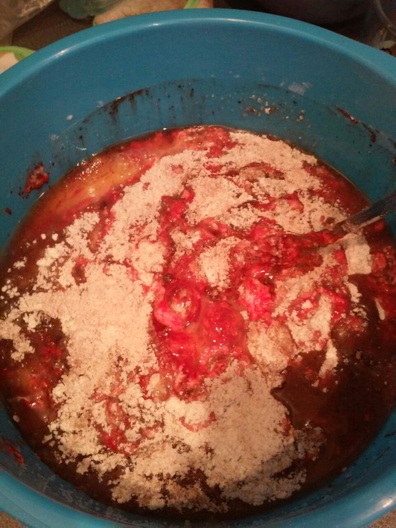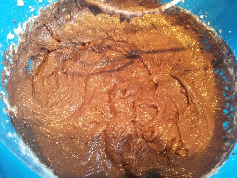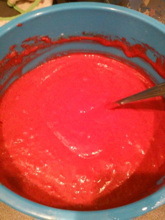 Смешать 130 г растопленного масла, 3 яйца, стакан сахара, стакан сметаны, ванилин, 1 ст.л. какао, 2 ст.л. разрыхлителя, красный гелевый краситель: