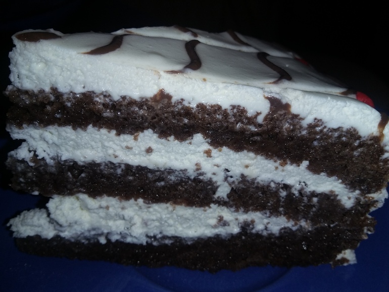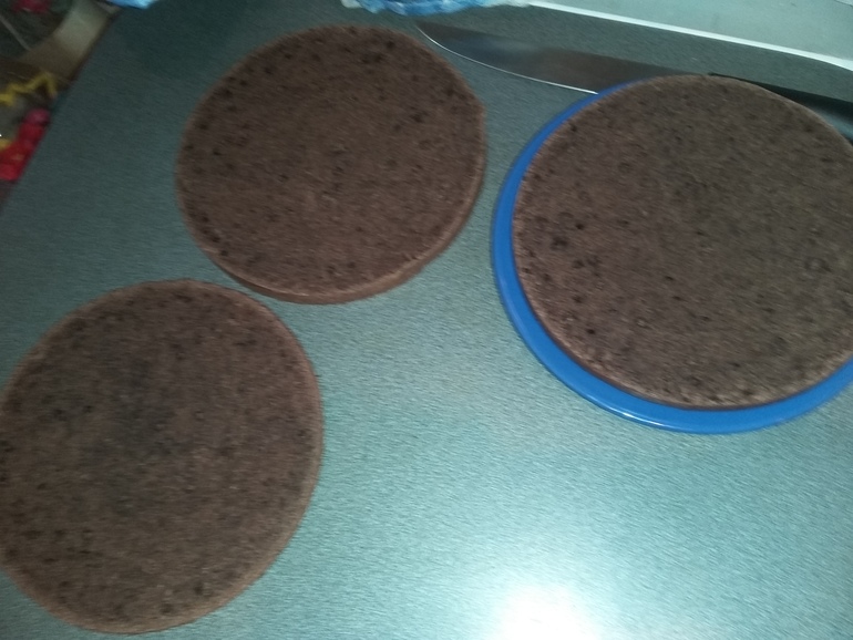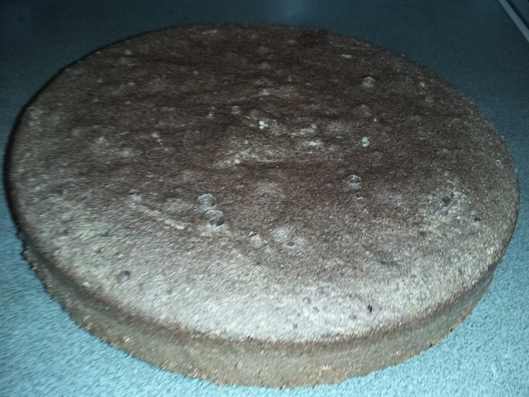 Советуют выпекать по очереди 3 коржа в смазанной маслом форме. Доча пекла сразу все тесто в мультиварке. Правда 90 минут... Остудить и разрезать: