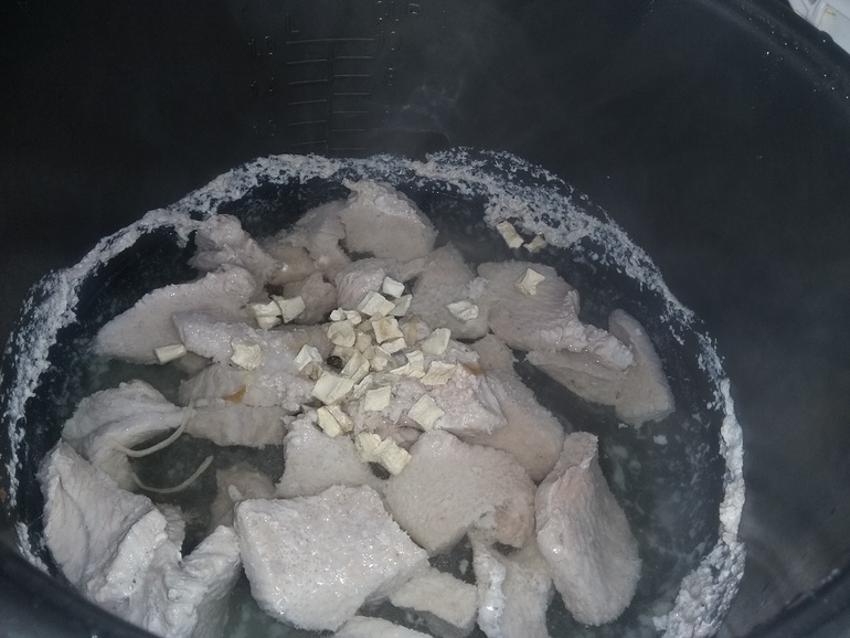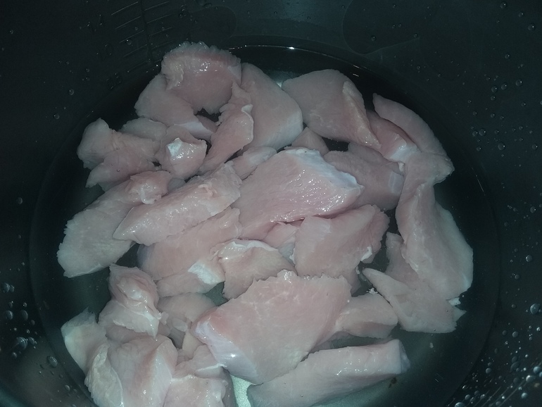 В чашу мультиварки сложить кусочки грудки индейки, влить 1 стакан воды и тушить 20 минут: