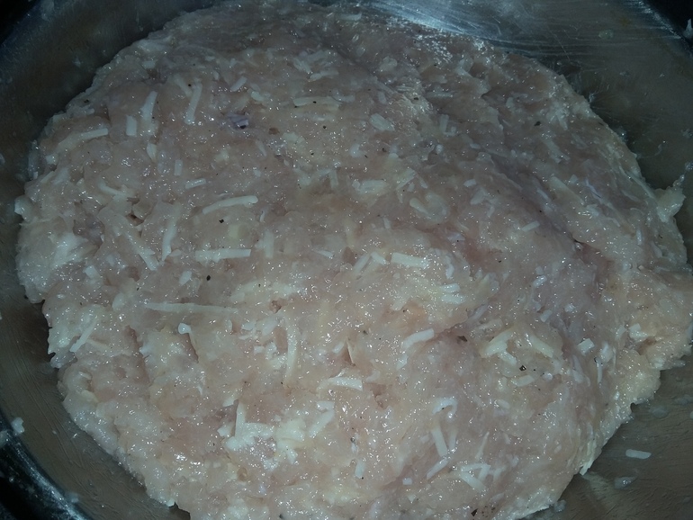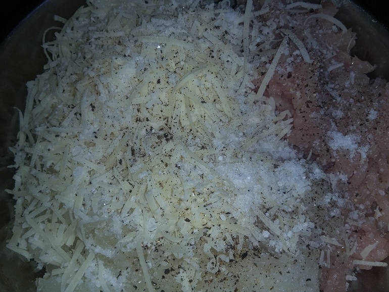 Добавить пол стакана натертого острого сыра. Посолить, поперчить:
