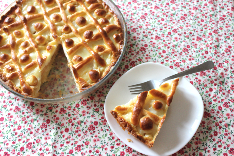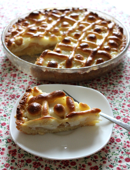 Смешать сахар, яйцо и нежирную сметану). Добавить размягченное сливочное масло и муку, просеянную с разрыхлителем и ванилином. Быстро замесить тесто. Тесло должно быть мягким, нежным и даже немного липнуть к рукам. Крупное яблоко очистить, нарезать на тоненькие ломтики. В форму выложить большую половину теста, равномерно распределить его и сделать бортики по краю формы. Равномерно разложить на тесто яблочные ломтики. На яблоки выложить остывшую уже начинку-крем. Второй частью теста украшаем).