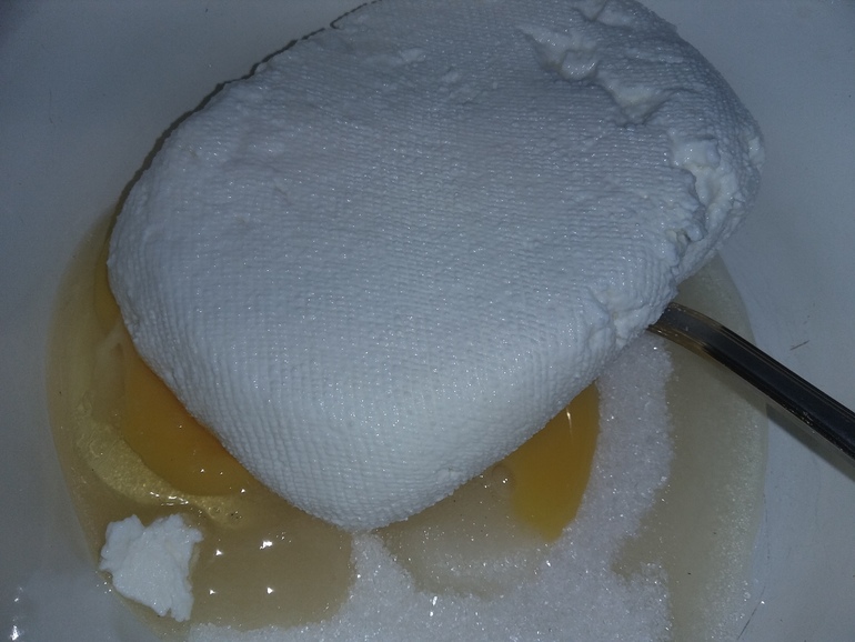 Добавить приготовленный творог (или пачку покупного):