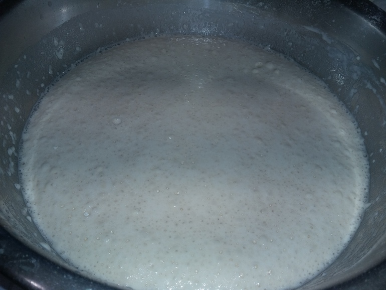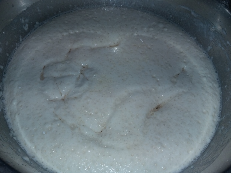 Закрыть опару пленкой, поставить в теплое место. Взошла, запузырилась: