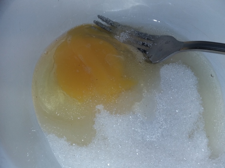 Смешать в миске 4 ст.л. сахара, ванилин и 1 яйцо: