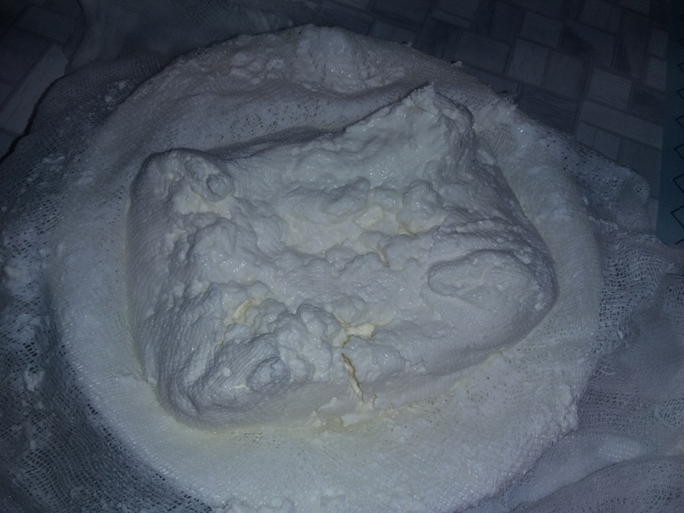 Все свернулось. Переложила в марлю, отвесила. Получилось около 200 г домашнего жирного творога: