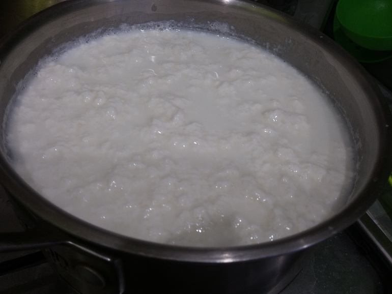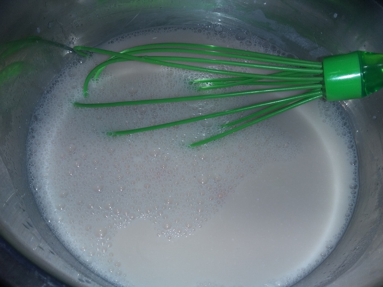 Сметана мне очень нравится, но продается у нас в расфасовке по 800 г. Для сметанного крема беру пару упаковок. Для готовки (салатов, супов) беру 1. И вот всегда грамм 500-600 остается. Так же случилось и после Нового года. Скисло 600 г сметаны (20%). Купила еще литр молока, смешала, поставила на маленький газ: