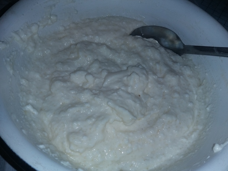А сама жидкость (сыворотка, пахта, обрат - названий у нее много!) пошла на тесто. На 700 мл теплой сыворотки 50 г дрожжей, 3 ст.л. сахара, 1 ч.л. соли: