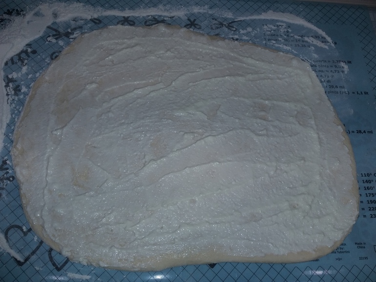 Смазать растопленным маслом (а я остатками творожной начинки намазала):