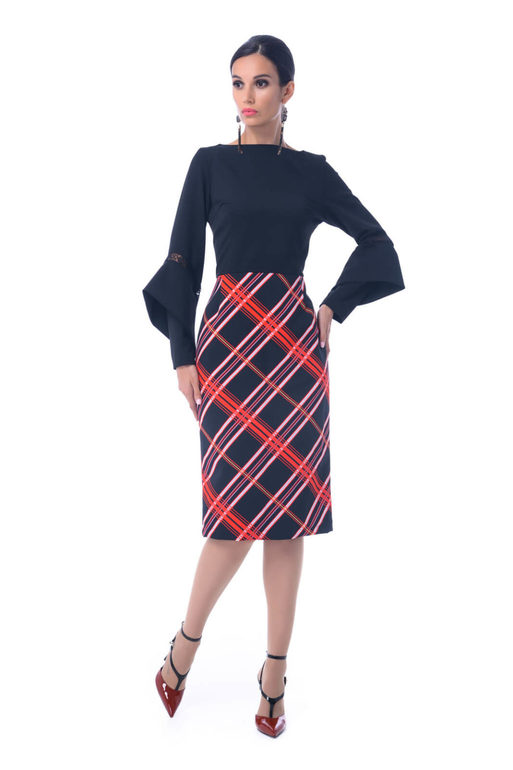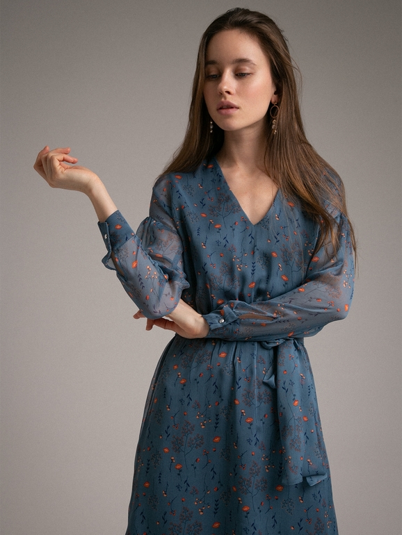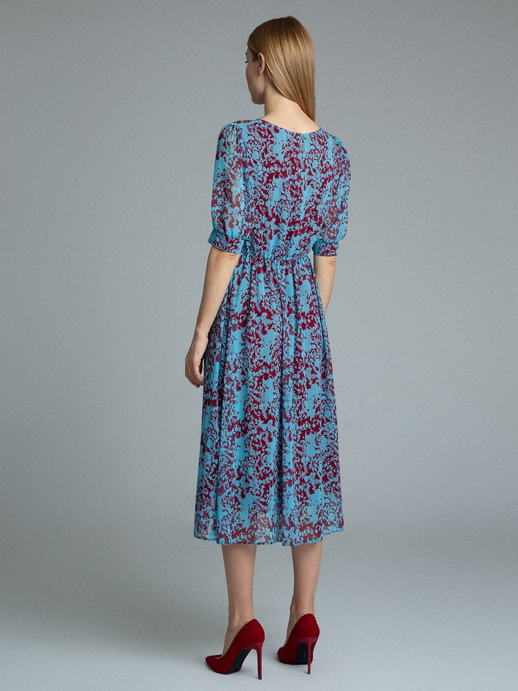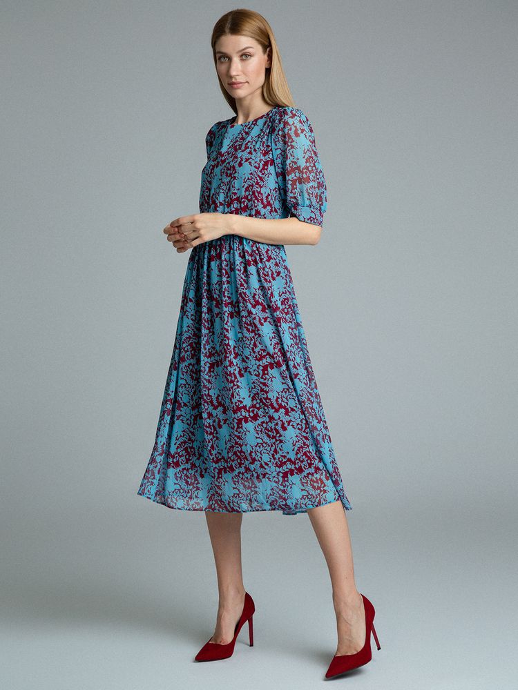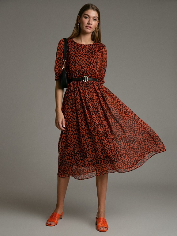 Платье с геометрическим орнаментом. Модель А-силуэта, отрезная линия талии на резинке, есть подкладка. Имеет круглый вырез, рукава 3/4, пояс входит в комплект. Сзади в среднем шве расположена застежка-молния. Ремень ...