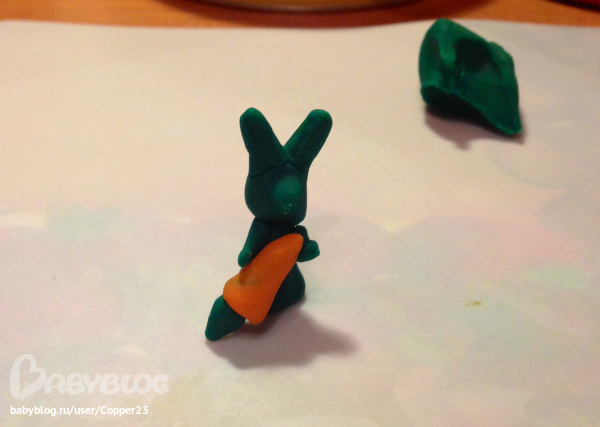 вот такого очаровательного зеленого зайку слепил папа Ване:) моих зверей очень трудно опознать:))