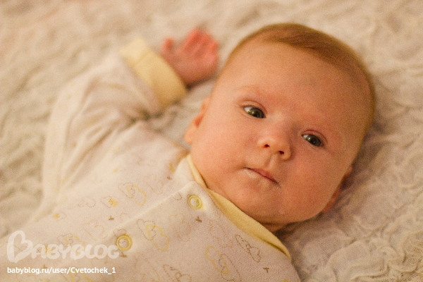 Любит, когда с ней разговаривают. Постоянно гулит, лепечет что-то на своем..собенно под утро, когда я только-только в сон ухожу. Ночью, конечно, я устаю...бутылки меня выматывают, кормлю каждые 2 часа. Как жаль, что у нас так и не получилось кормиться грудью (( Соску сосем, самую обычную, не силиконовую...Когда соски нет, то во рту у нас кулачки. С таким смаком их обсасывает, что даже мне иногда хочется их попробовать )) Спит, моя хорошая, всегда в кроватке...очень редко кладу ее с собой.