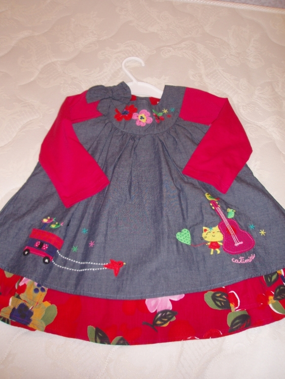 Catimini новое, только бирку сняли при примерке (бирку сохранила) 1800р., размер 18 мес., думаю и больше можно. Замеры: длина 48 см, ширина по пройме 29см., рукав от горловины (плеча нет), 33 см Яркое, многослойное платье, тонкая джинса, рукав - трикотаж, нижний слой - микровельвет.