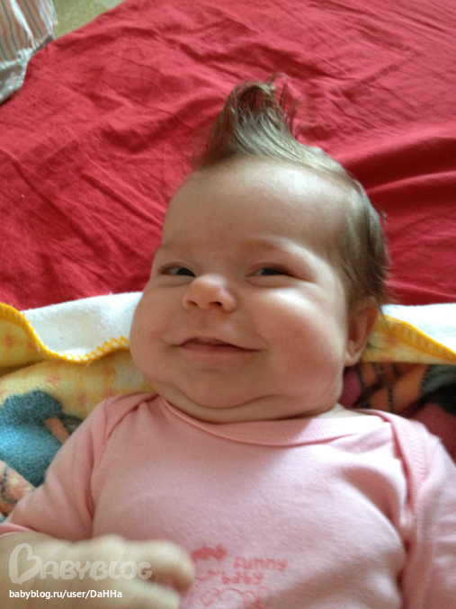 Такая милая! Мы с вами в один день родили. У вас такая волосатая, моя не такая, залысина уже на затылке. В коляске мы пока так не лежим под наклоном, только полностью лежим, не хочет капризничает.
