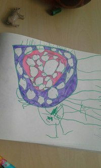 А теперь Илюня рисует монстров, запортачив с десяток монстров он очень попросил меня помочь ему его раскрасить, цвета выбирал сам. Это монстр-чайник, у него пар над головой.
