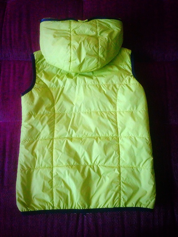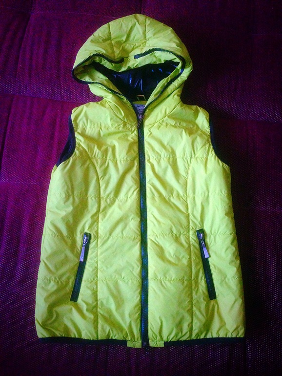 1. Жилетка дутая, яркая, утеплена синтепоном, очень удобная. Карманы на молниях, закрывает шею. Ношена немного, подойдет на размер 42-44. Цена 400 р.