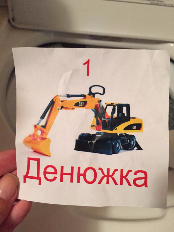 От идеи встал вопрос: как избежать использования настоящей валюты? не превращать детство в денежную единицу? Мы с мужем до того обсуждали вопрос, что дома мы оба не хотим платить детям за что бы то ни было, скажем, за мытье посуды - доллар. Семья - это семья, а не работа. В семье надо помогать друг другу, а не зарабатывать друг на друге. Вполне возможно, что в дальнейшем я вернусь еще к пересмотру этого вопроса, так как учить зарабатывать деньги собственным трудом тоже необходимо, но точно не в 3,5 года. Поэтому встал вопрос: ЧТО именно должна ему отдавать стиральная машина? Как это должно выглядеть? Вопрос встал очень остро, когда после того, как мы Антоше купили потти трейнинг часы, он писал по ним и за целый день не было ни одного промаха. Он это сообразил и ринулся искать "денюжку на экскаватор". "А как выглядит денюжка? ты знаешь хоть, что именно ты ищещь?" - "Да, - говорит Антоша, - бумажечку".