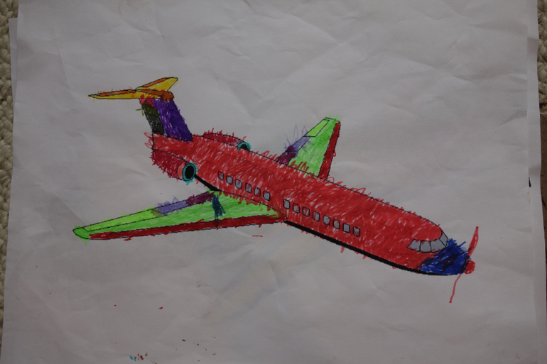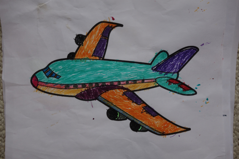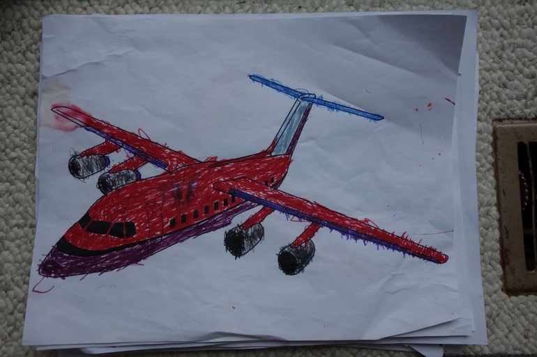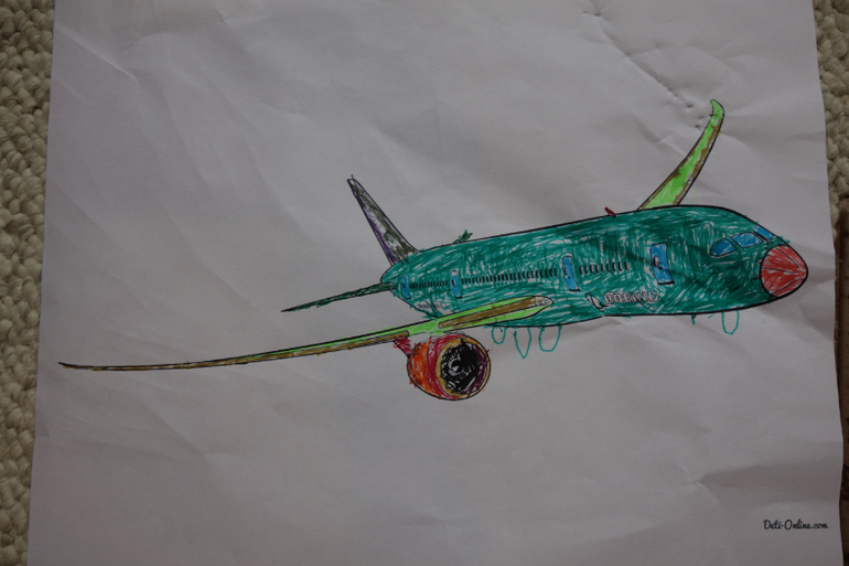 Как видно на первом фото, Антошик дорисовывает еще от себя: пропеллер нарисовал и солнышко. Но это не самая первая его проба. Первый самолетик вот он: