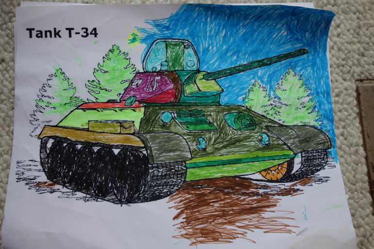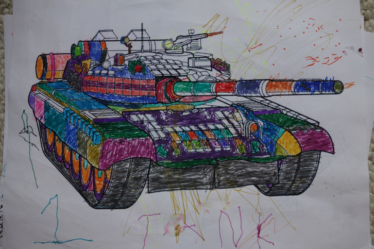 Модель выбралась сложная, Антошик уставал его разрисовывать и, чтобы как-то отвлечься, на обороте листа рисовал луг с цветочками, мушками, мошками, пауками и бабочками. Подписал, правда, тоже "Танк". Видимо, танк в засаде.