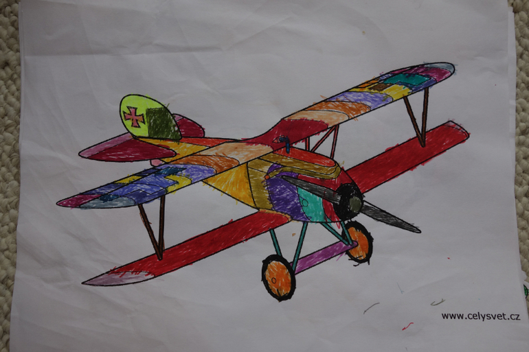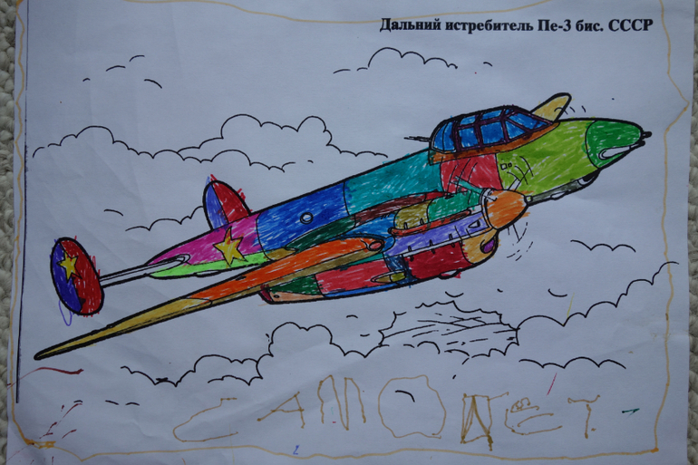В последние пару недель Антоша увлекся разрисовываением всяческой техники. Он просит меня набрать в интернете "раскраски для детей ***", где *** - это название техники: самолет, или танк, или вертолет, или квадрокоптер, а потом сам выбирает картинку, которую я ему распечатываю. Я удачно перед этим заказала детям смываемые фломастеры (Амелюше потолще и покороче, Антоше потоньше и подлиннее), так что все сошлось. Самый первый самолет Антоша еще как бы учился разрисовывать - проводить линии вдоль, поперек, закрашивать тонкие детали. Но чем дальше, тем все ровнее и аккуратнее у него получается. Дальше - больше: он придумал подписывать свои рисунки.