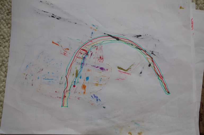 Кстати, рисовал-то правильно, по порядку, согласно цветовому спектру радуги: красный, оранжевый, желтый, зеленый, голубой (им же и обвел потом, правда, всю картину), синий и фиолетовый.