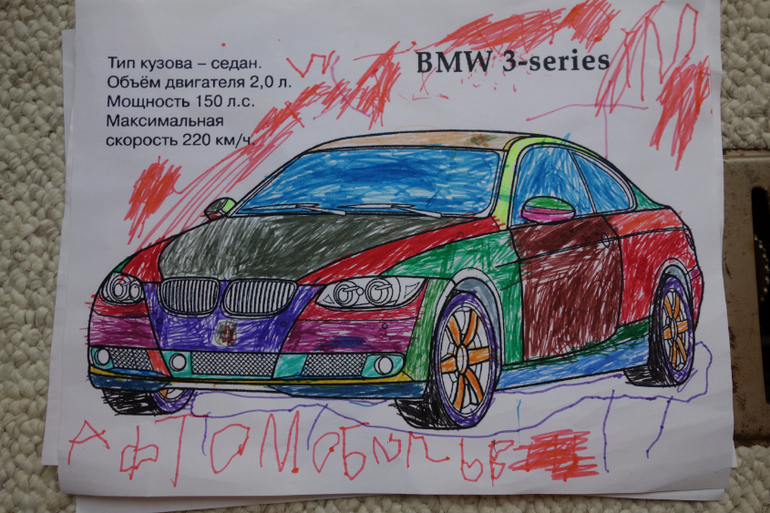 Осталось сегодняшние рисунки показать. Первый - это дорисованный со вчерашнего дня "АФТОМОБИЛЬ BMW" (вверху зачеркнуто предыдущее название "автамо"):