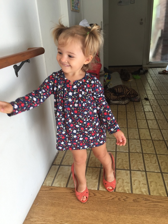 Дама дамой во всем всегда и везде: любит мои каблуки, щеголяет в них по дому, находит кисточки для макияжа и рисует себе щечки. Если кисточек нет, то фломастер подойдет для наведения красоты. И чем ярче, тем краше получается.