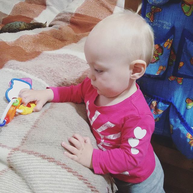 Аня обожает играть с братом и смотреть мультики. Смотрит Тини Лав, Лунтика и свинку Пеппу. Стараюсь много не включать - только либо когда надо что-то срочно сделать, а она не дает, либо когда в машине реветь начинает и ничем не успокоить. Есть любимые игрушки. Очень любит своего ежика, обнимает его все время, спит с ним.