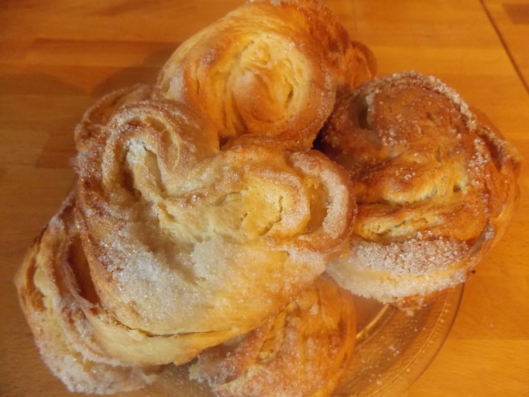 Все ингредиенты для теста заложить в хлебопечку, выставить режим "Тесто" (у меня этот режим для приготовления дрожжевого теста занимает полтора часа). Я после сигнала оставила тесто на подогреве доходить. Оно поднялось очень сильно, уперлось в крышку хлебопечки. Разделать тесто на шарики одинакового размера, раскатать в лепешки, смазать растопленным сливочным маслом, посыпать сахаром (примерно 1 ч.л.) и сформовать плюшки. Дать им расстояться минут 20-30, затем выпекать в разогретой до 180 градусов духовке до готовности.