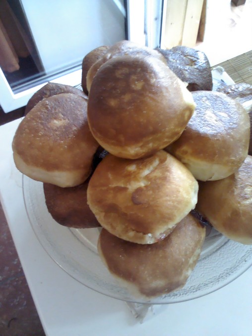 Очень вкусные пончики с джемом, посыпать пудрой не успела, т.к. детки и муж не дали им даже остыть, все съели.