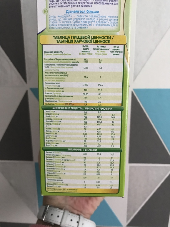 Практически с самого рождения мы на искусственном вскармливании.Пробовали много разных смесей.С года решили попробовать молочко Nestogen 3.Ну во первых компания Nestle-это как гарант качества,я им доверяю)Во вторых молочко с пребиотиками и лактобактериями,что не может не радовать.У молочка отличный состав,много витаминов и микроэлементов и что не мало важно-не содержит сахара (а мы крупные для своего возраста) и пальмового масла.